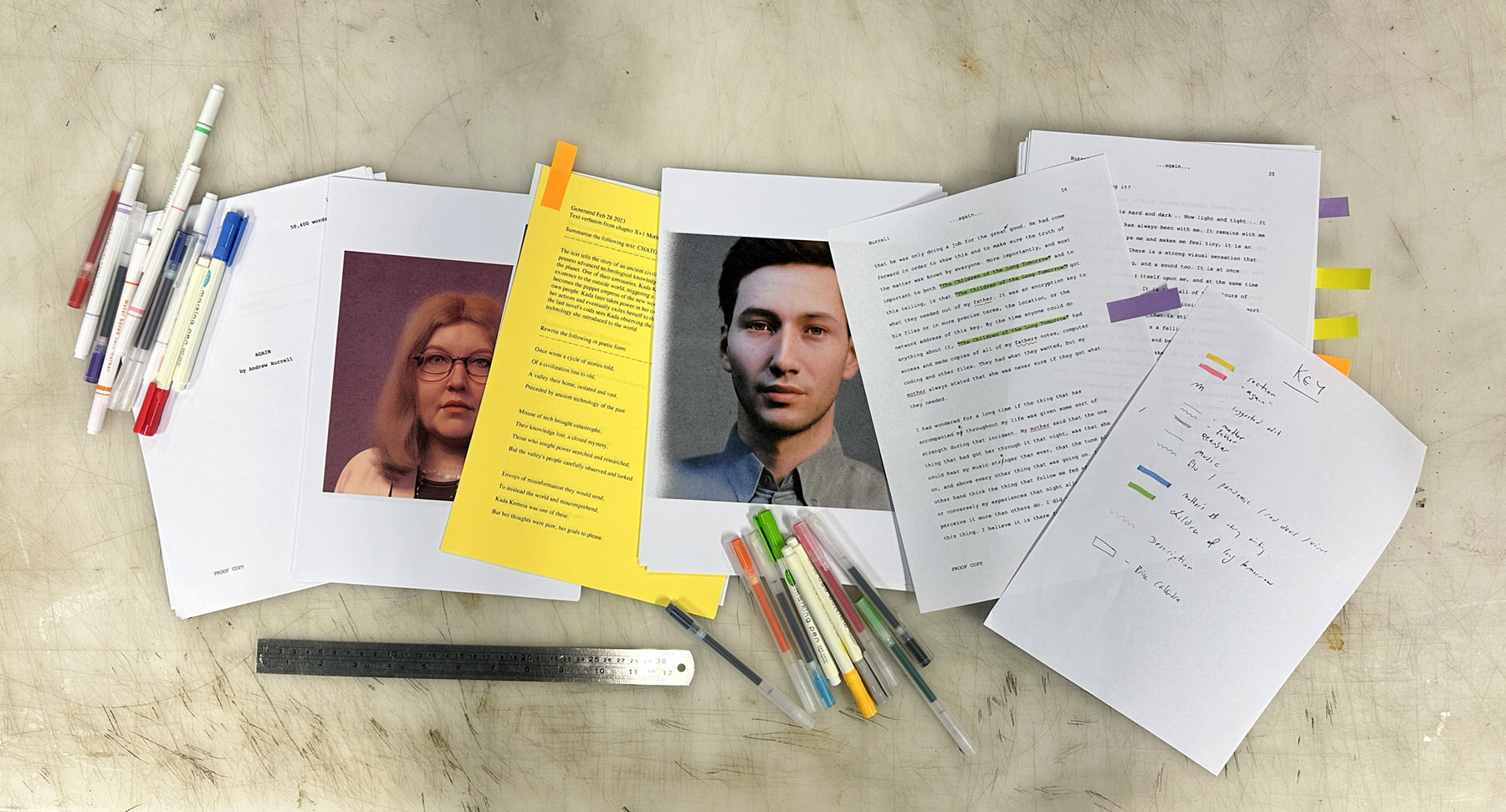 The image above shows work in progress annotating and generating text ad images from the original 2010 text, "Again".