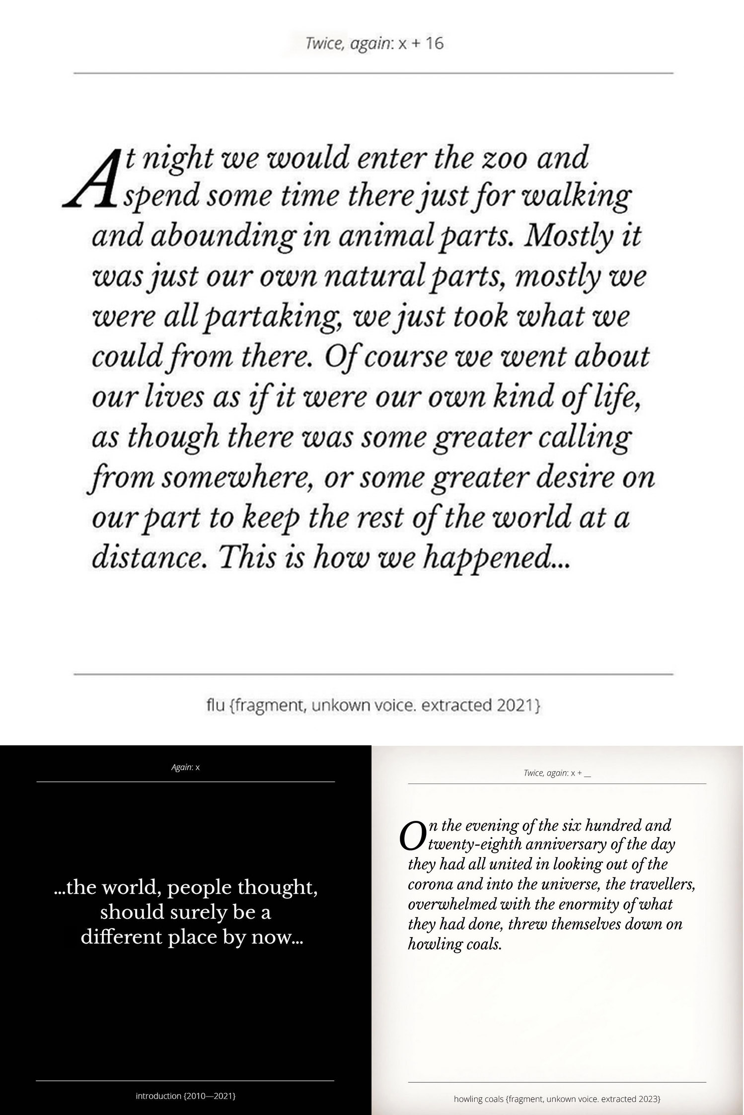 A series of text fragments generated throughout the experimental processes of this project are presented, slowly updating on a number of screens. These are "pulled" from a server which is kept updated by the artists on an ongoing manner. These texts are hand-curated and typeset with "meta-data" that indicates their position place in the larger narrative world.