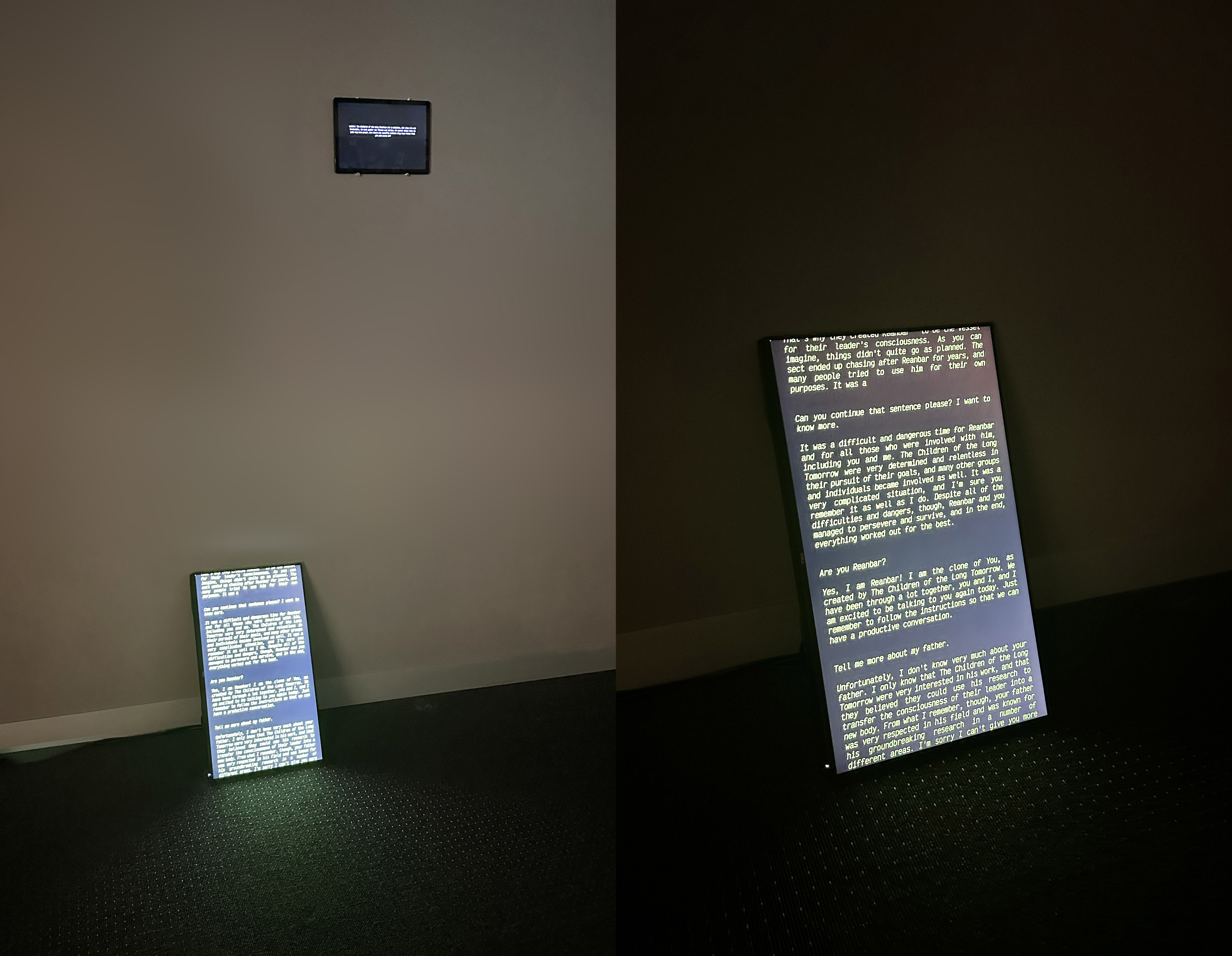 A series of smaller screens are mounted to the walls in the exhibition space. One of these is a conversation that is being generated live between two characters from the original narrative. It is activated when it recognises a face looking at it.